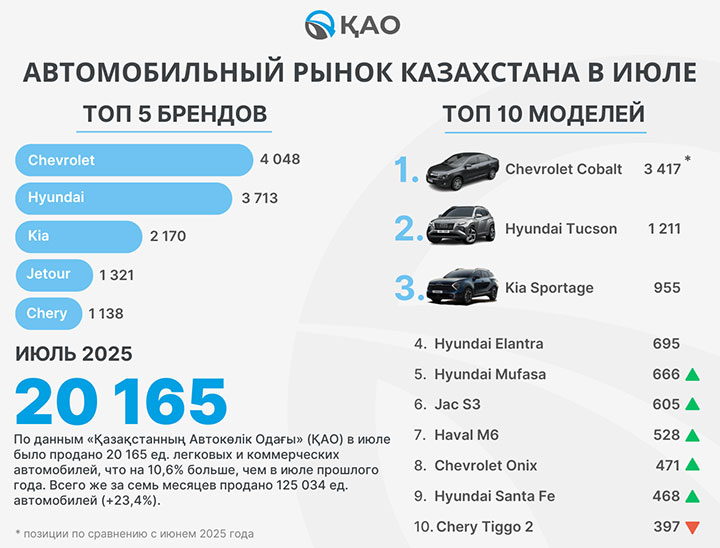 Июльские продажи – 20 165 легковых автомобилей и коммерческой техники – на 3,9% превзошли итоги июня и стали наиболее весомым месячным показателем с января текущего года. Рынок предлагает широкий ассортимент автомобилей различной комплектации, способных удовлетворить самые разные запросы покупателей. Показательно, что восемь из десяти наиболее продаваемых моделей собирают в Казахстане. В тройке брендов лидеров продаж Chevrolet (4 048 ед.; +70,4%, по сравнению с июлем прошлого года), Hyundai (3 713 ед., -14,4%) и Kia (2 170 ед., +11,9%). В модельной линейке по итогам июльских продаж лидируют Chevrolet Cobalt (3 417 ед.), Hyundai Tucson (1 211 ед.) и Kia Sportage (955 ед.).